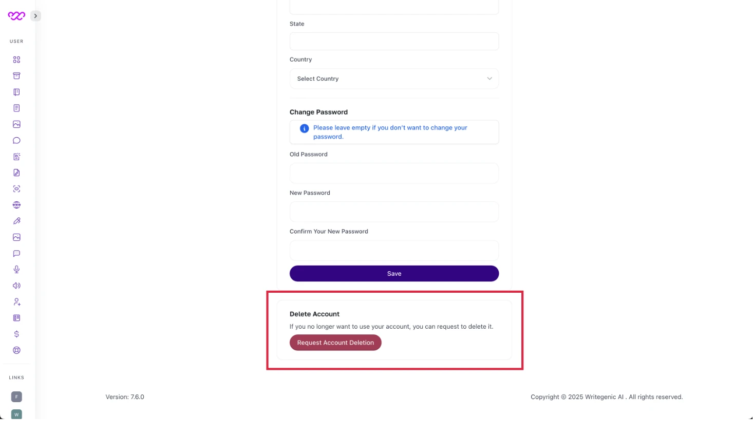 Scroll down to see the option of "Request Account Deletion" button. Click the button and we will remove your account accordingly. Think twice before deleting the account as you will lose all your settings, saved documents, images, brand voice, etc.