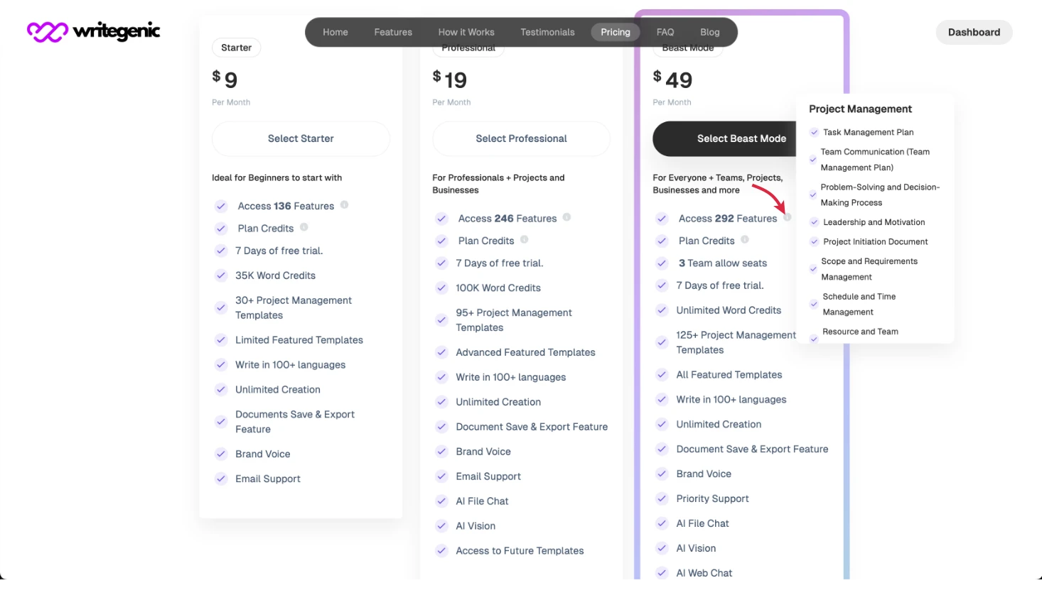 If you want to see the glimpse of which AI templates are included in a plan, you can check that from the tool tip of our homepage pricing section as shown in the image below: