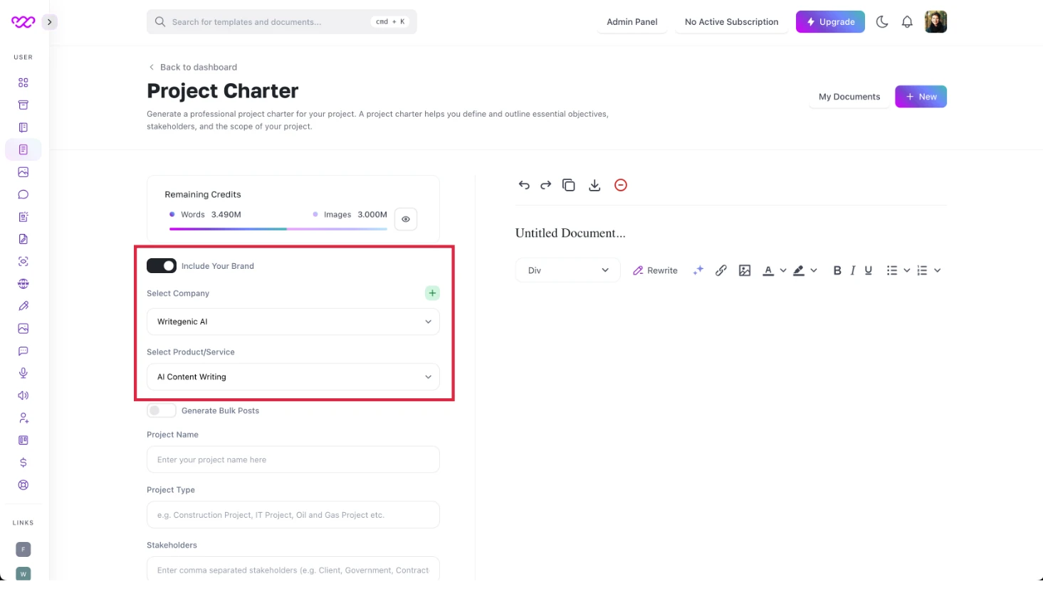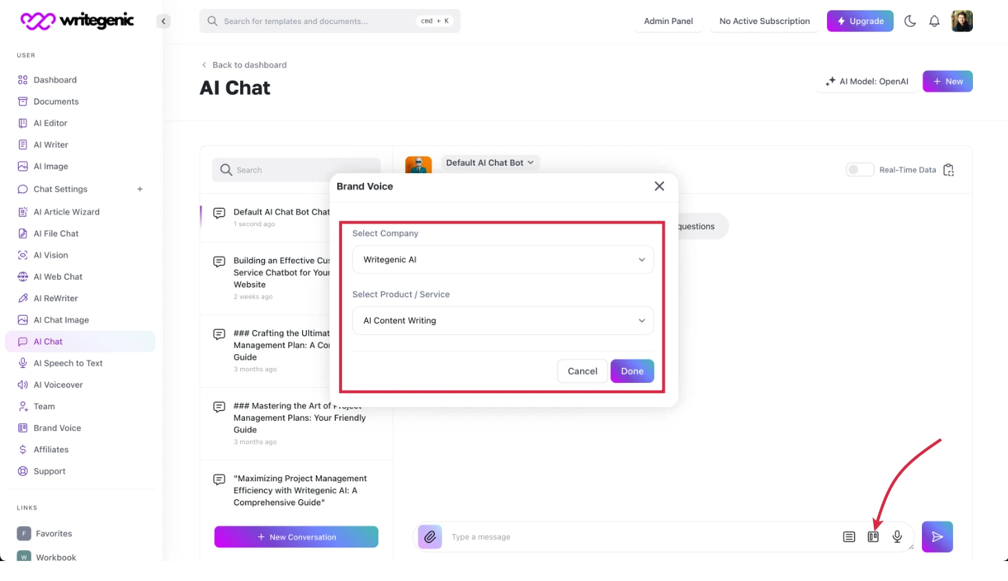 Now, consider a project scenario. If you're working on a project requiring multiple documents, use the brand voice option where you've pre-entered the project's details. There's no need to repeatedly input the project's scope. Just enable the brand voice option, and Writegenic AI will handle the rest.