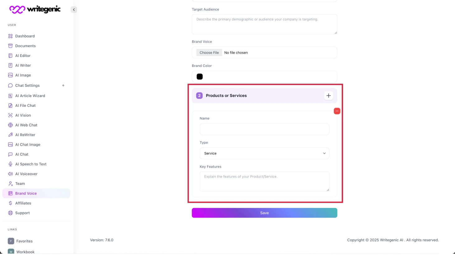 Enter your services one by one [optional]. If you want to create the documents for separate services then fill this section, otherwise leave it empty and mention all the services details in the description section under form no. 1. Click "save" button and your brand voice is ready.