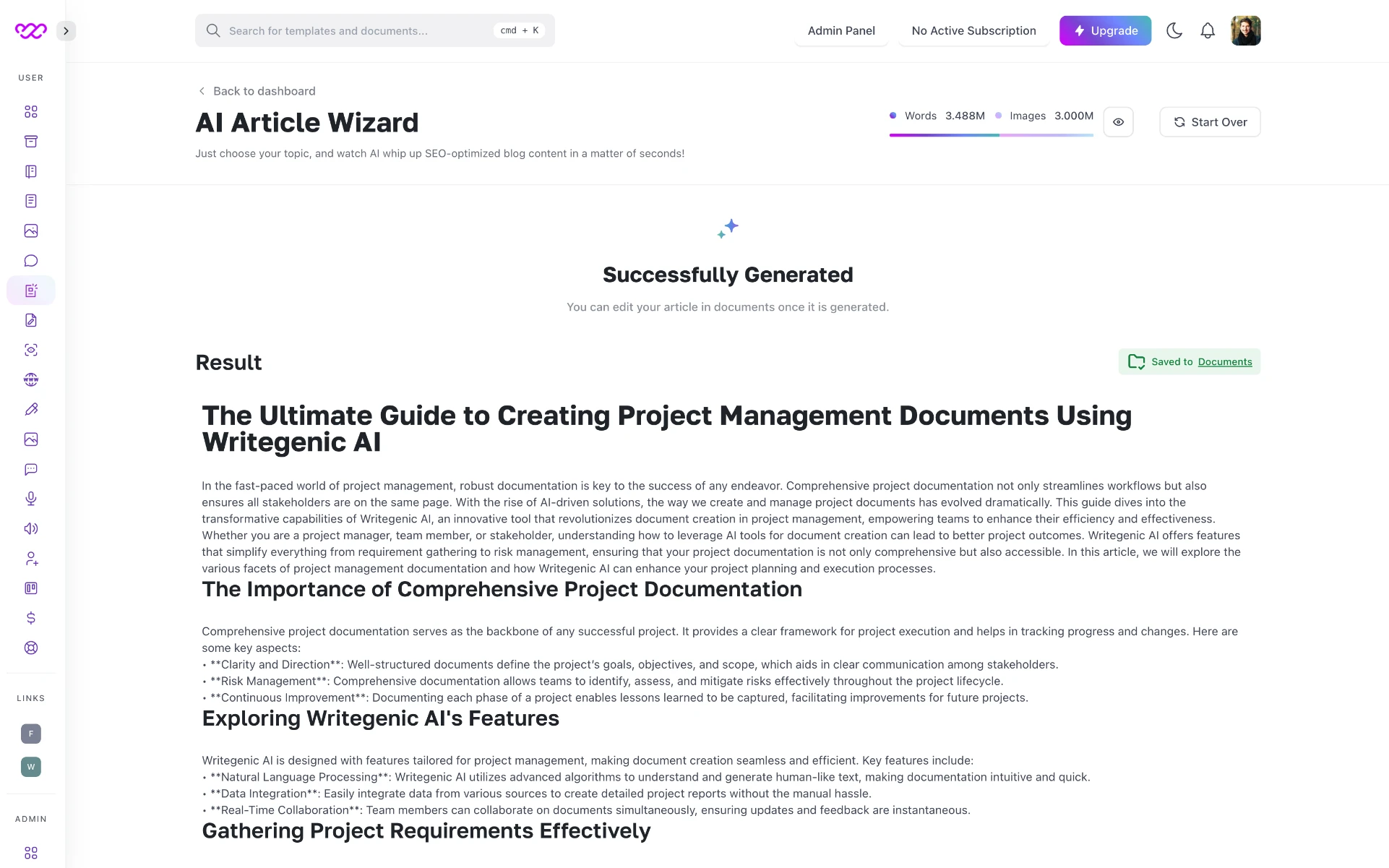 The article saves to the documents automatically which you can extract from the "Documents" section of the dashboard. You can open your document, do the edits either manually or using our Magical AI tool. Once finalized, simply click the download button to download it to MS-word format. If you want to use it for your website, simply copy it and paste in your website.
