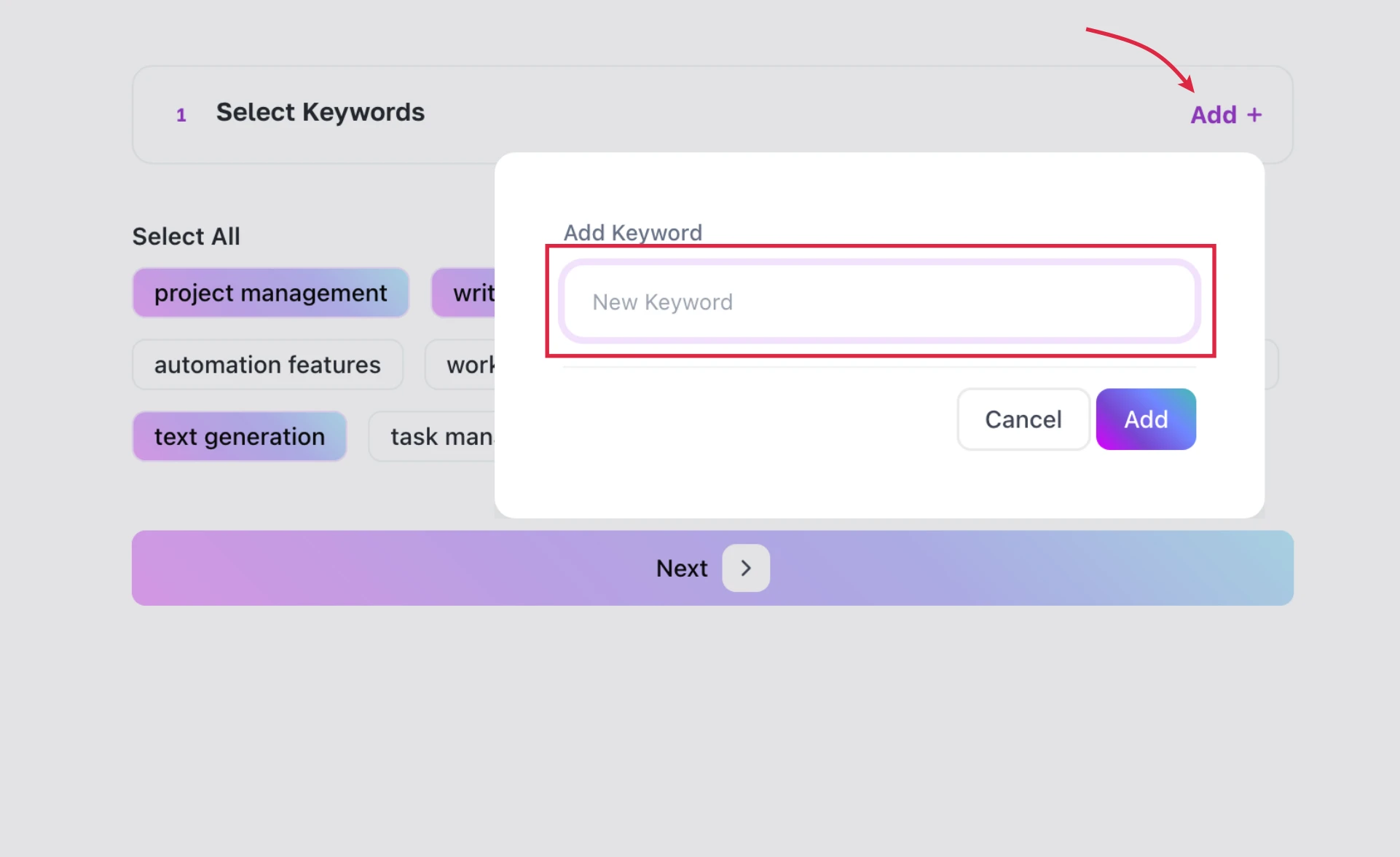 You can also add your keywords if you have done your own keyword research. Simply click the "Add+" button as shown in the image below to add your keywords manually.