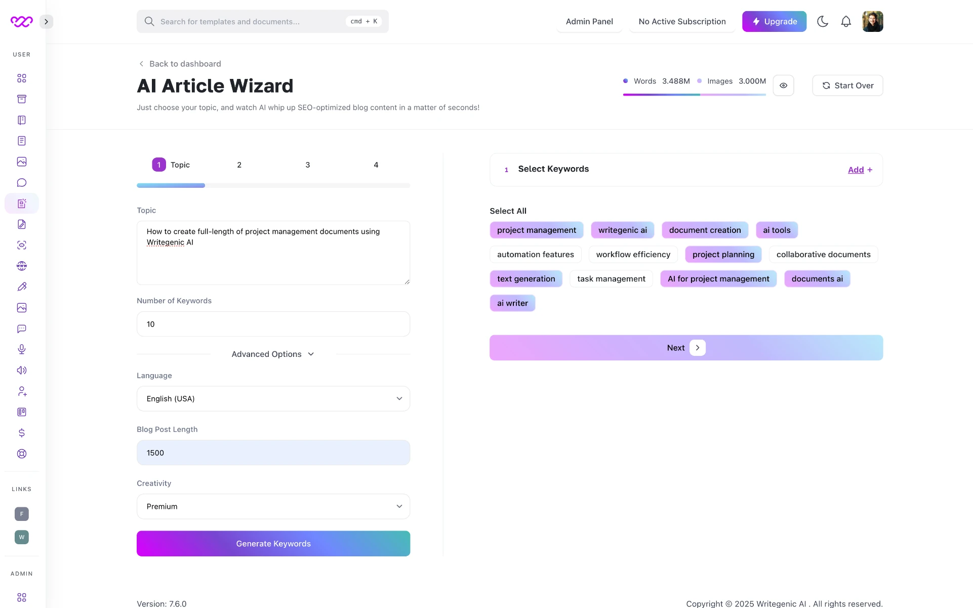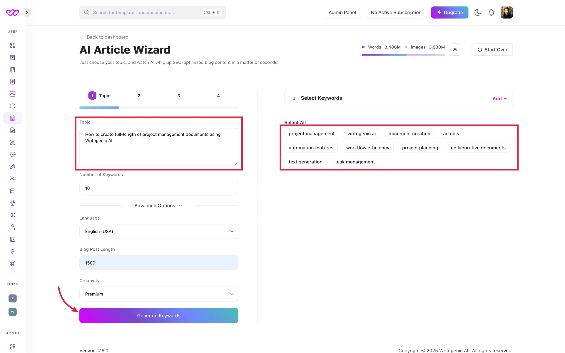 Note: You can give enter the number of topics to choose from. You also have an option to choose the title length according to the SEO requirements.