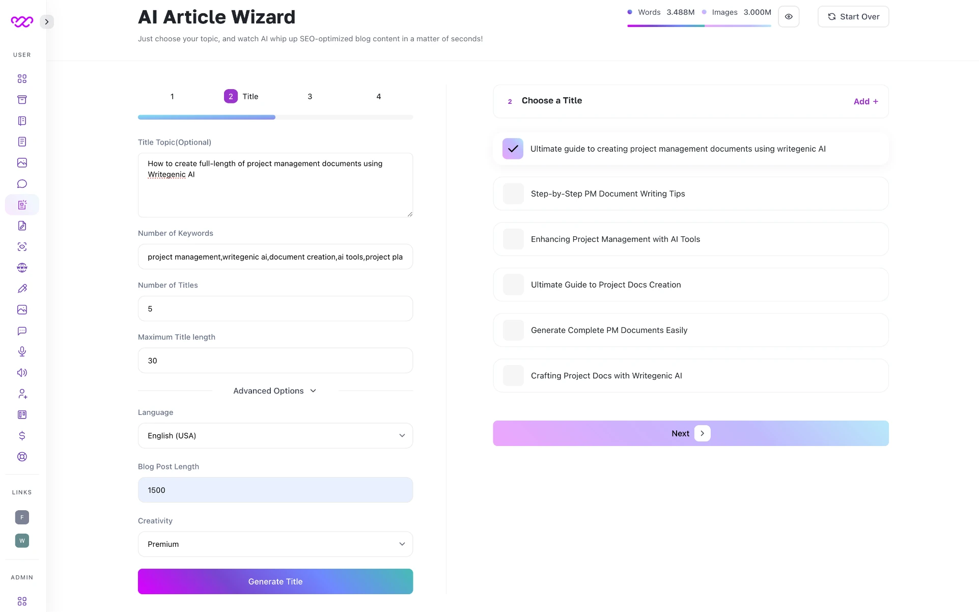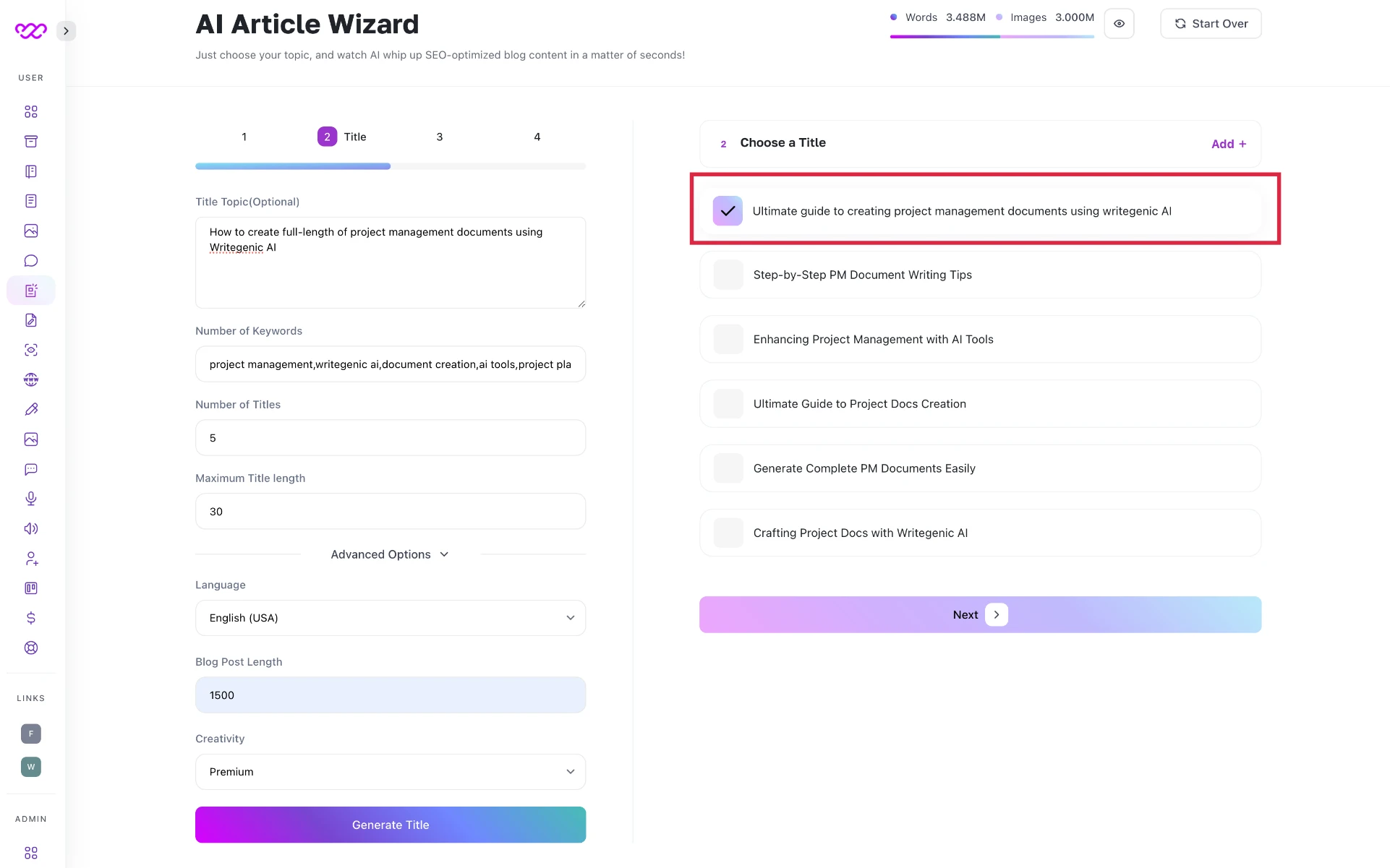 You now have multiple topics to choose from. If you don't like any title, you can either recreate the titles by clicking "Generate Title" button, or simply add your own title by clicking the "Add+" button. Click "Next" when you are done.