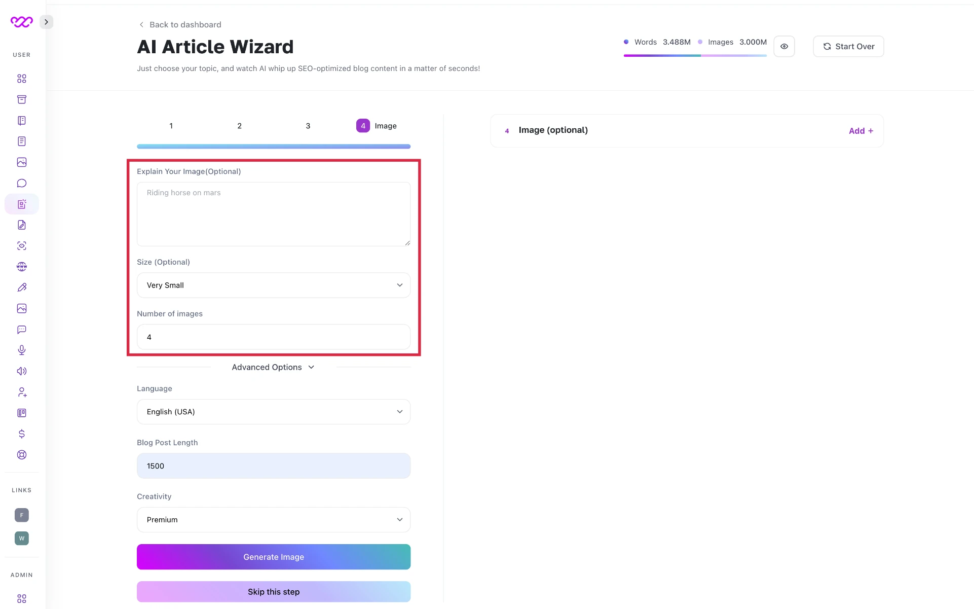 This step is optional. Either you want to generate it through AI or choose your own is up to you. If you want to generate it using AI, give a perfect prompt that you think suits the topic of the article, set the size of the image, chose the number of the images you want to generate, and finally click "Generate Image" button.