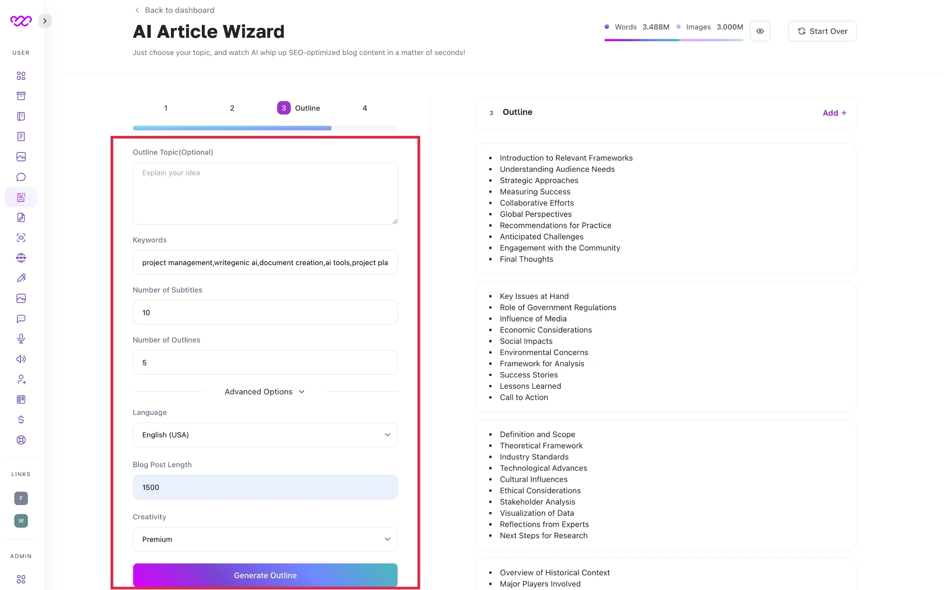 The next step is to generate the outlines for your article. We would recommend to add your topic even it is shown as optional. Enter the required fields and click "Generate Outline" button.