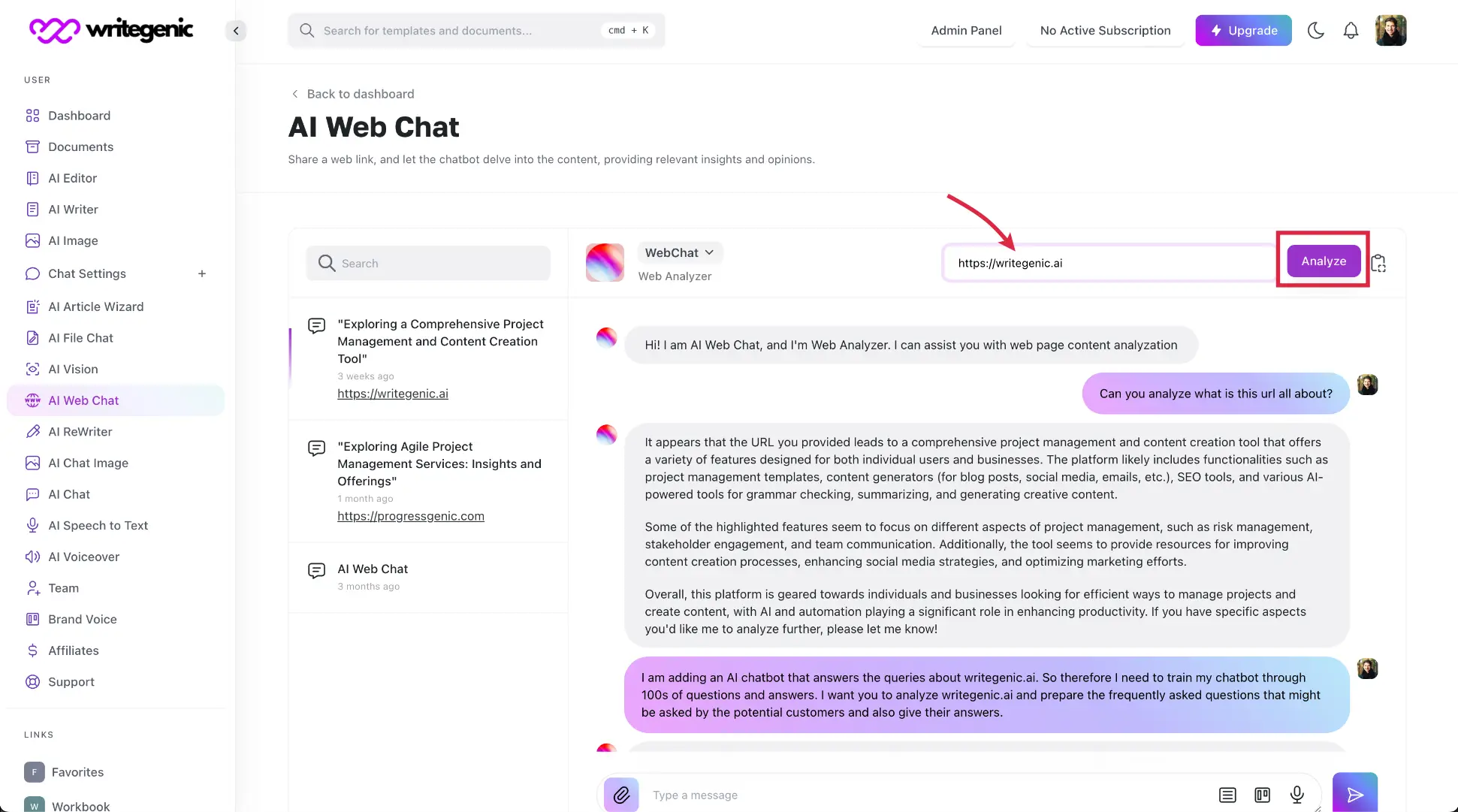 Once analyzed, start asking your queries to the chatbot specific to the given website url.