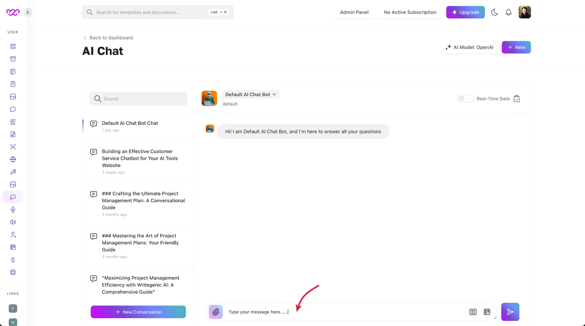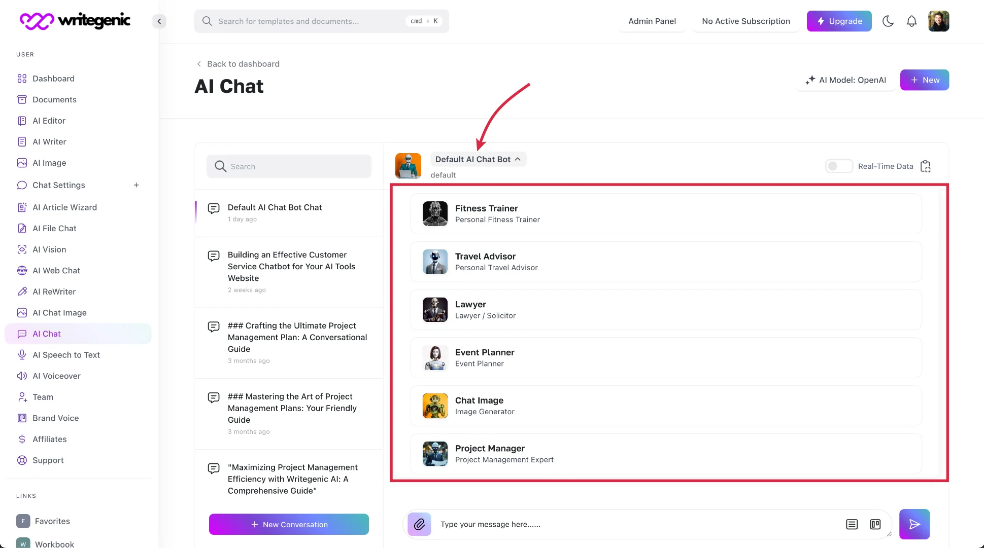 From you dashboard, click the "AI Chat" feature from the left panel to open the chat window. Select the suitable chatbot from the dropdown list as shown below: