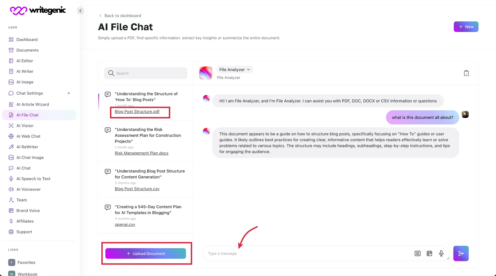 If you want the chatbot to analyze and talk specifically according to your own files/ documents, simply upload your file/ document and start asking the questions similar to how it is done in AI chat previously.